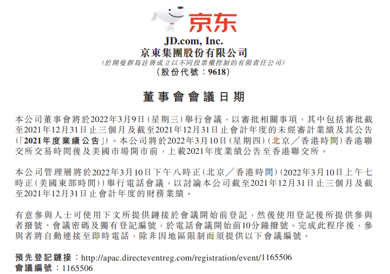 欧陆注册2月24日消息,昨日晚间,京东集团宣布将于美国东部时间2022年3月10日美国股市开盘前(北京时间3月10日晚)发布2021年第四季度及全年财报。财报发布后,京东管理团队将于美国东部时间3月10日上午7点(北京时间3月10日晚8点)举行分析师电话会议,解读财报结果,并回答分析师提问。