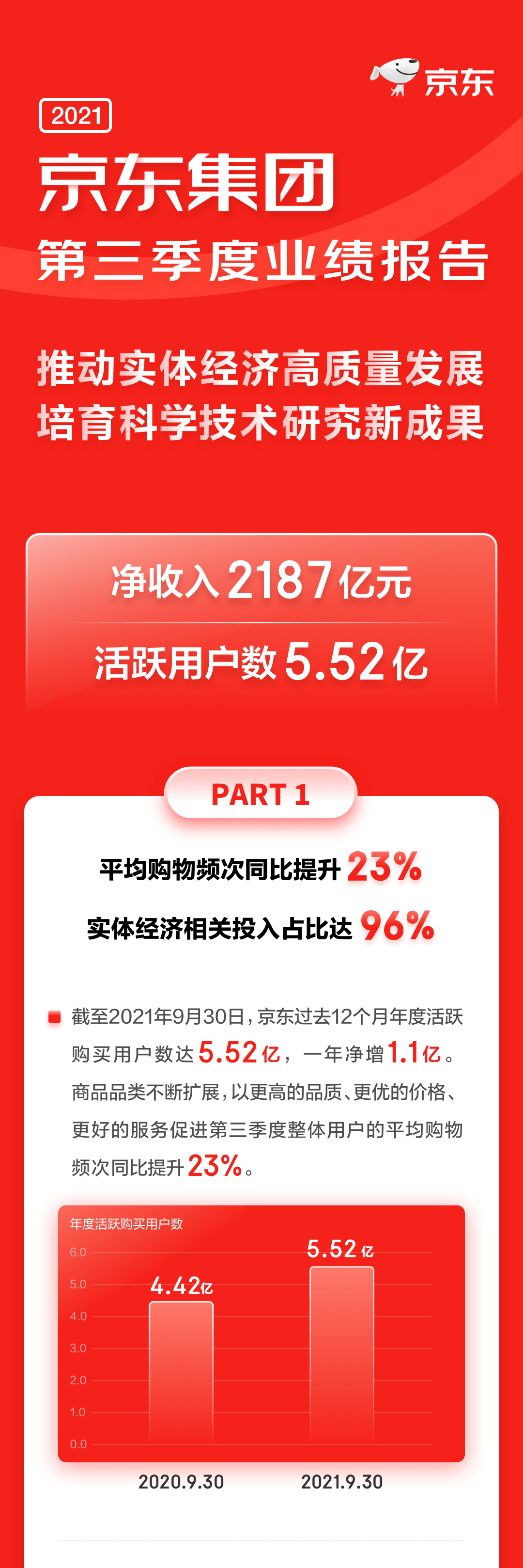 截至2021年9月30日,京东过去12个月的活跃购买用户数较2020年同期的4.416亿增长25.0%至5.522亿。